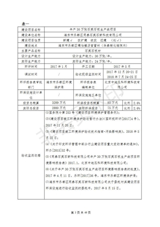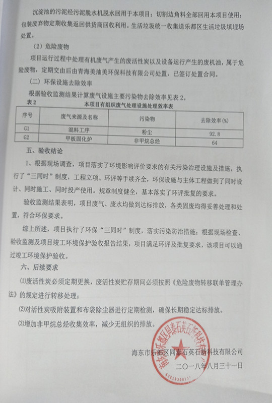 根據(jù)中華人民共和國(guó)國(guó)務(wù)院令第253號(hào)《建設(shè)項(xiàng)目環(huán)境保護(hù)管理?xiàng)l例》(中華人民共和國(guó)國(guó)務(wù)院令第682號(hào)《國(guó)務(wù)院關(guān)于修改〈建設(shè)項(xiàng)目環(huán)境保護(hù)管理?xiàng)l例〉的決定》和《建設(shè)項(xiàng)目竣工環(huán)境保護(hù)驗(yàn)收暫行辦法》,嚴(yán)格依照有關(guān)法律法規(guī),建設(shè)項(xiàng)目環(huán)境保護(hù)設(shè)施驗(yàn)收技術(shù)規(guī)范,本項(xiàng)目環(huán)評(píng)報(bào)告表和環(huán)保審批部門審批意見以及企業(yè)自行驗(yàn)收相關(guān)要求等對(duì)本項(xiàng)目進(jìn)行驗(yàn)收,本項(xiàng)目符合環(huán)保驗(yàn)收條件,可以通過環(huán)保驗(yàn)收。 海東市樂都區(qū)同泰科技有限公司竣工環(huán)境保護(hù)驗(yàn)收監(jiān)測(cè)報(bào)告公示