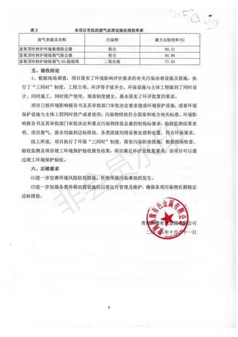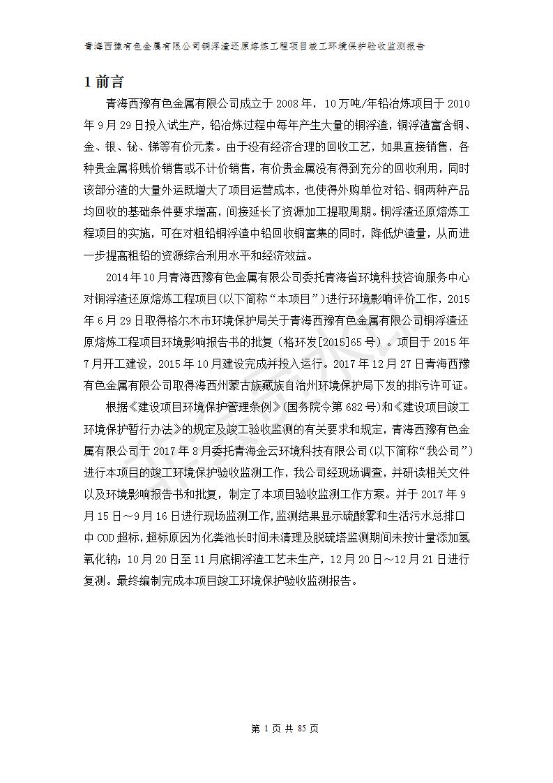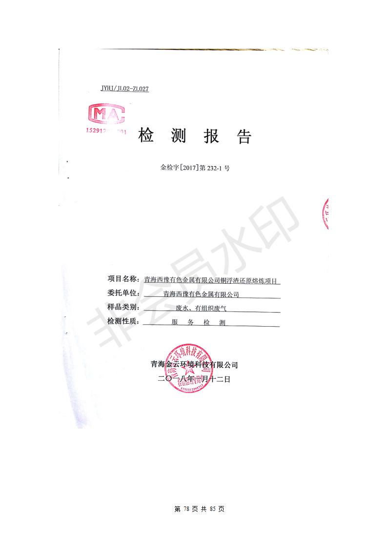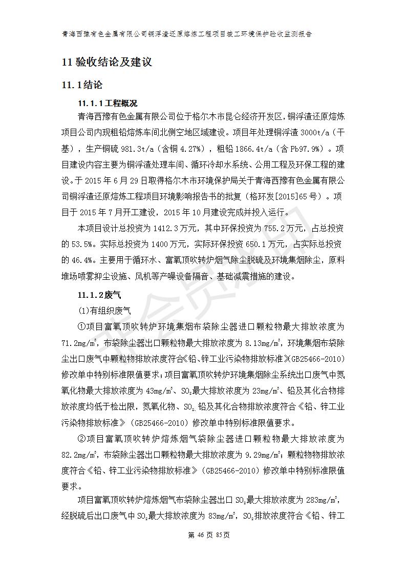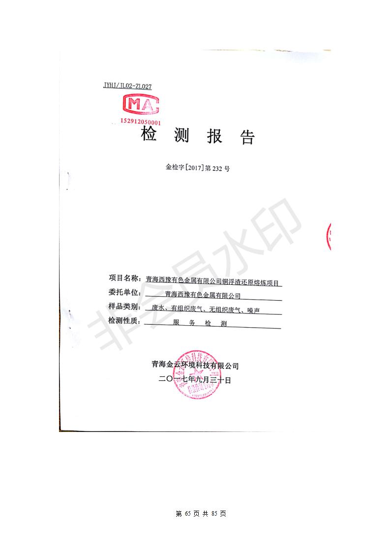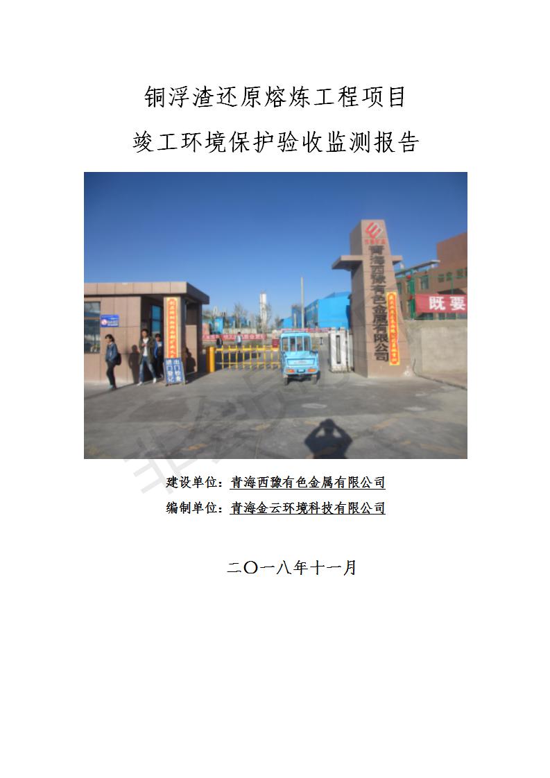 青海西豫有色金屬有限公司銅浮渣還原熔煉工程項目竣工環(huán)境保護驗收監(jiān)測報告公示發(fā)布日期:(2018-11-23) 點擊次數(shù):2638 |