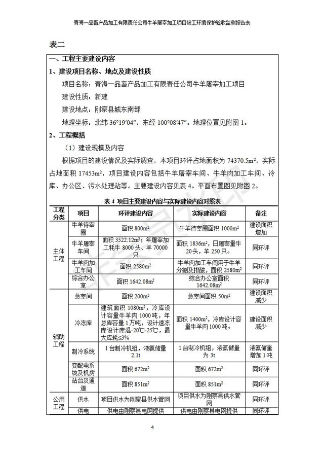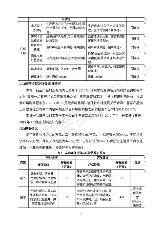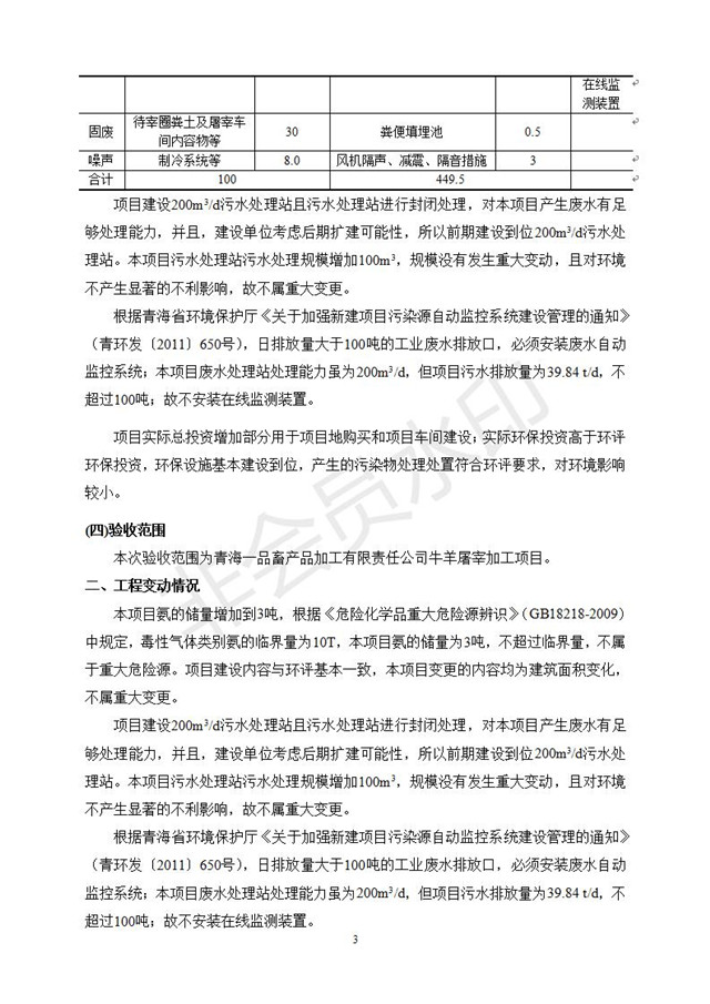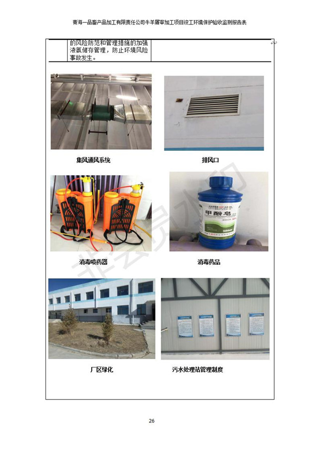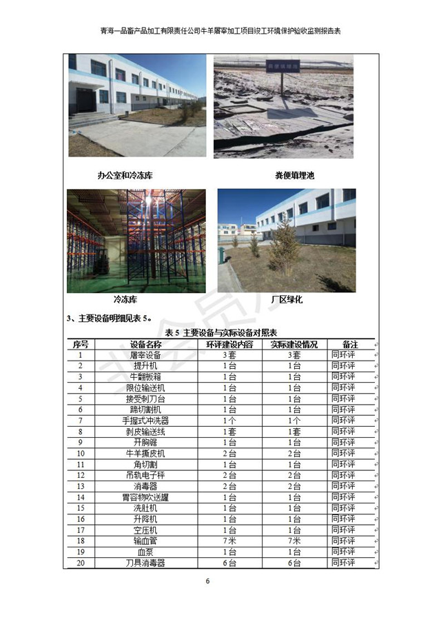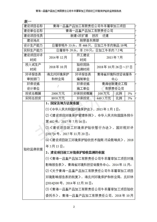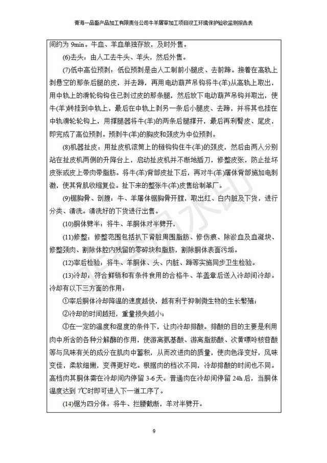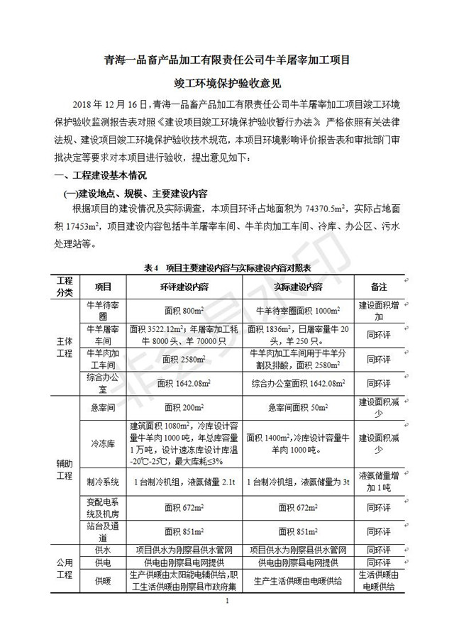 根據(jù)中華人民共和國(guó)國(guó)務(wù)院令第682號(hào)《國(guó)務(wù)院關(guān)于修改〈建設(shè)項(xiàng)目環(huán)境保護(hù)管理?xiàng)l例〉的決定》和《建設(shè)項(xiàng)目竣工環(huán)境保護(hù)驗(yàn)收暫行辦法》(國(guó)務(wù)院令682號(hào)),青海一品畜產(chǎn)品加工有限責(zé)任公司牛羊屠宰加工項(xiàng)目(包括竣工環(huán)境保護(hù)驗(yàn)收監(jiān)測(cè)報(bào)告表和驗(yàn)收意見(jiàn))公示如下。 一、項(xiàng)目名稱(chēng):青海一品畜產(chǎn)品加工有限責(zé)任公司牛羊屠宰加工項(xiàng)目竣工環(huán)境保護(hù)驗(yàn)收監(jiān)測(cè)報(bào)告表 二、地點(diǎn):剛察縣縣城東大街加油站東側(cè) 三、建設(shè)單位:青海一品畜產(chǎn)品加工有限責(zé)任公司 四、建設(shè)內(nèi)容:項(xiàng)目地面積17453m2,項(xiàng)目建設(shè)內(nèi)容包括牛羊屠宰車(chē)間、牛羊肉加工車(chē)間、冷庫(kù)、辦公區(qū)、污水處理站等。 五、聯(lián)系人:張工 七、公示時(shí)間:二〇一九年一月十一日至二〇一九年二月七日 公示期間,對(duì)上述公示內(nèi)容如有異議,請(qǐng)以書(shū)面形式反饋,個(gè)人須署真實(shí)姓名,單位須加蓋公章。