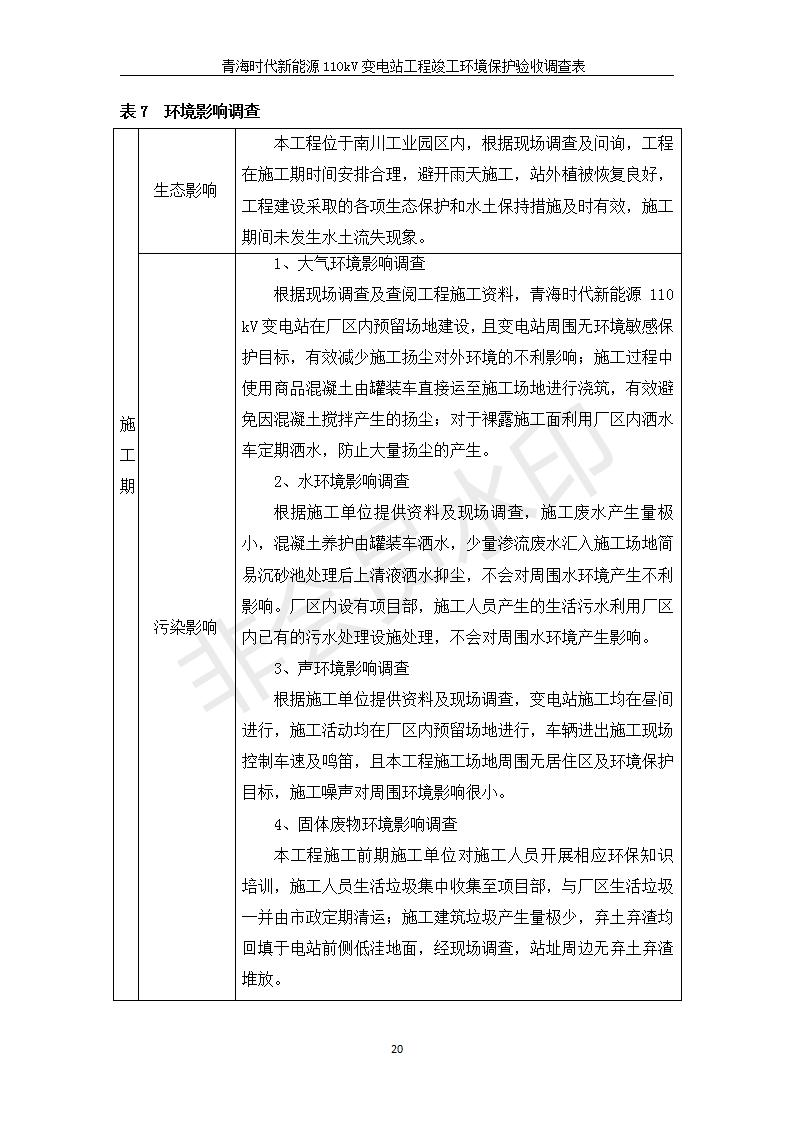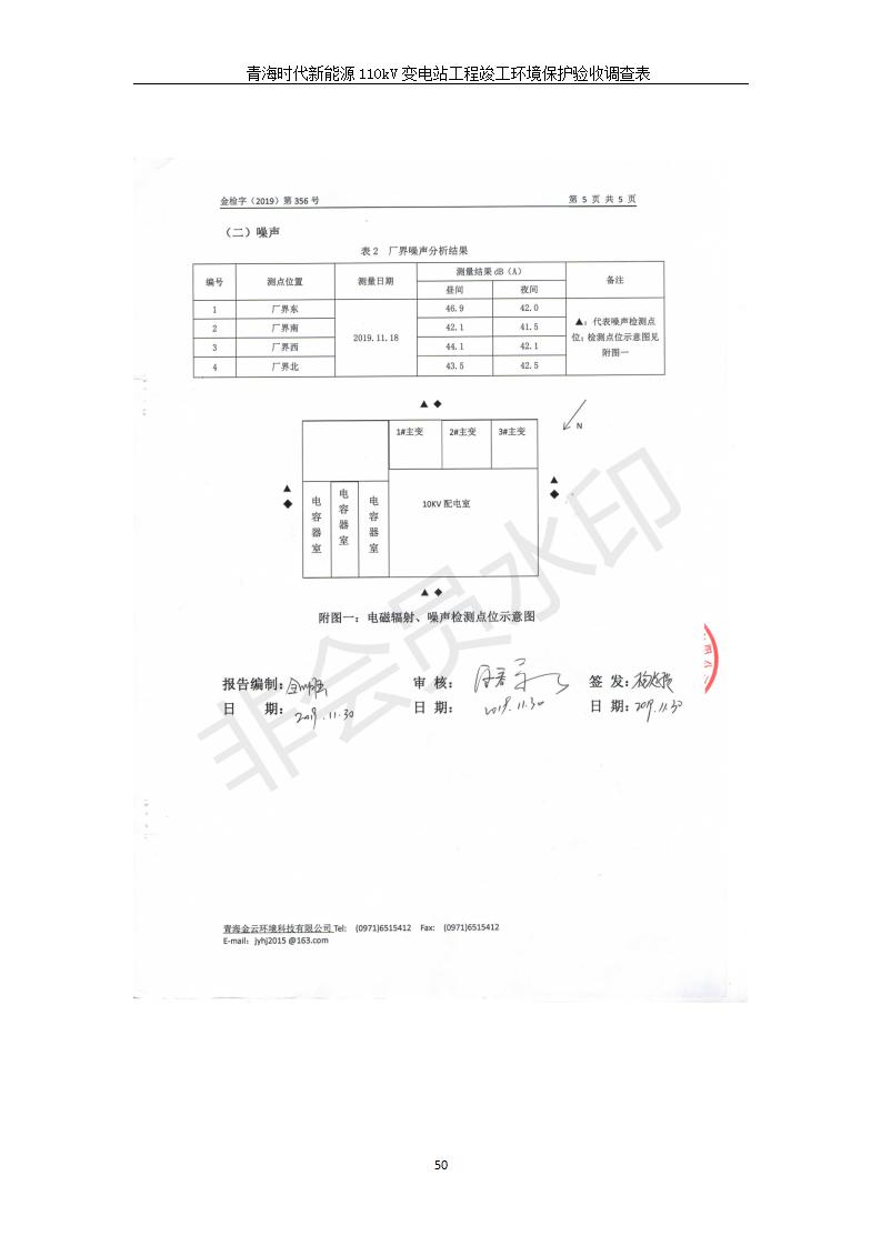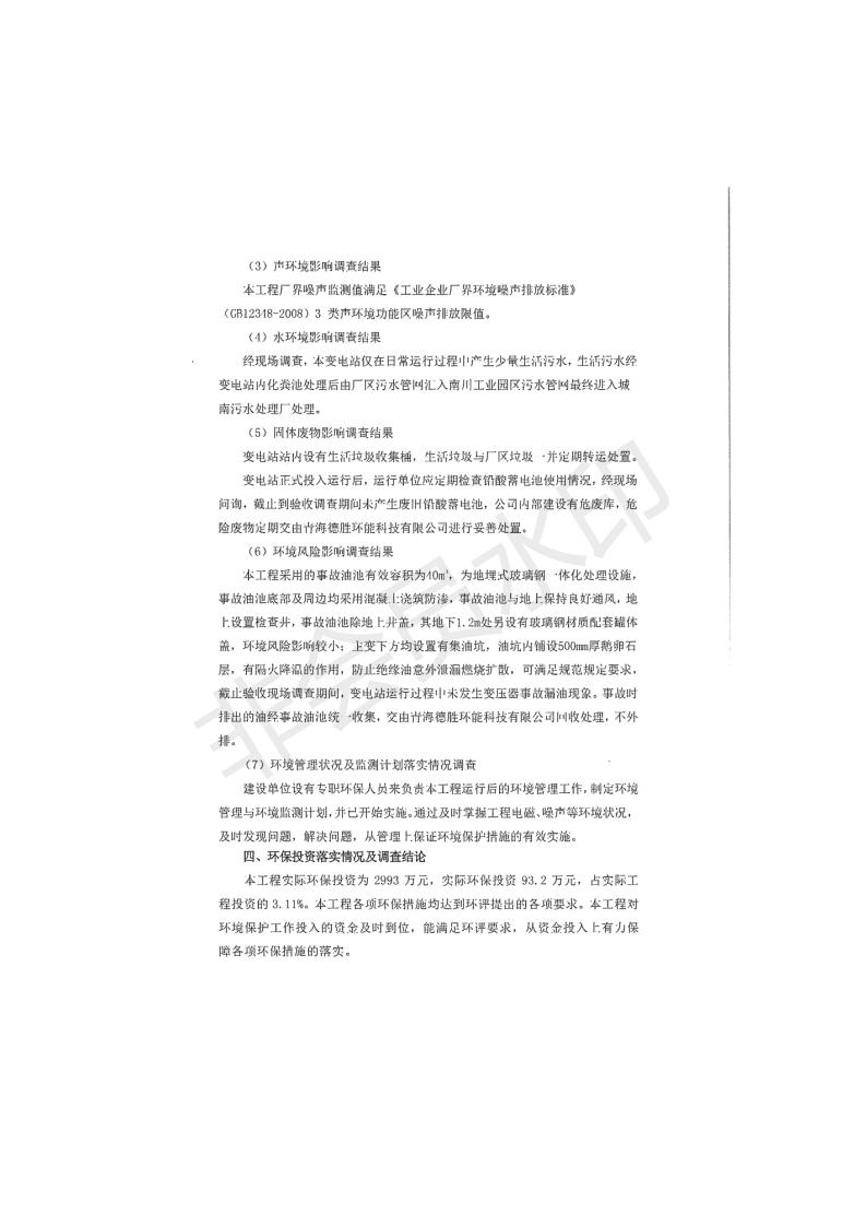 根據(jù)中華人民共和國(guó)國(guó)務(wù)院令第682號(hào)《國(guó)務(wù)院關(guān)于修改〈建設(shè)項(xiàng)目環(huán)境保護(hù)管理?xiàng)l例〉的決定》和《建設(shè)項(xiàng)目竣工環(huán)境保護(hù)驗(yàn)收暫行辦法》(國(guó)務(wù)院令682號(hào)),青海時(shí)代新能源110kV變電站工程(包括竣工環(huán)境保護(hù)驗(yàn)收調(diào)查表和驗(yàn)收意見)公示如下。 一、項(xiàng)目名稱:青海時(shí)代新能源110kV變電站工程 二、地點(diǎn):青海省西寧市南川工業(yè)園區(qū)創(chuàng)業(yè)路182號(hào)青海時(shí)代新能源科技有限公司廠區(qū)內(nèi) 三、建設(shè)單位:青海時(shí)代新能源科技有限公司 四、建設(shè)內(nèi)容:青海時(shí)代新能源 110kV 變電站采用全戶內(nèi)布置方式,依據(jù)環(huán)評(píng)報(bào)告及批復(fù)文件,經(jīng)現(xiàn)場(chǎng)踏勘本工程建設(shè)只包含變電站建設(shè)部分,輸電線路由南川工業(yè)園區(qū)管委會(huì)負(fù)責(zé)建設(shè),輸電線路不屬于本次驗(yàn)收調(diào)查范圍。工程本期規(guī)模2×31.5MVA,電壓等級(jí)為110/10kV。變電站 110kV 出線間隔最終2回,本期建設(shè)出線間隔2回;10kV最終電纜出線8回,本期電纜出線6回。 五、聯(lián)系人:張工 六、聯(lián)系電話:0971-6515411 七、公示時(shí)間:二〇二〇年一月十四日至二〇二〇年二月十三日 公示期間,對(duì)上述公示內(nèi)容如有異議,請(qǐng)以書面形式反饋,個(gè)人須署真實(shí)姓名,單位須加蓋公章。