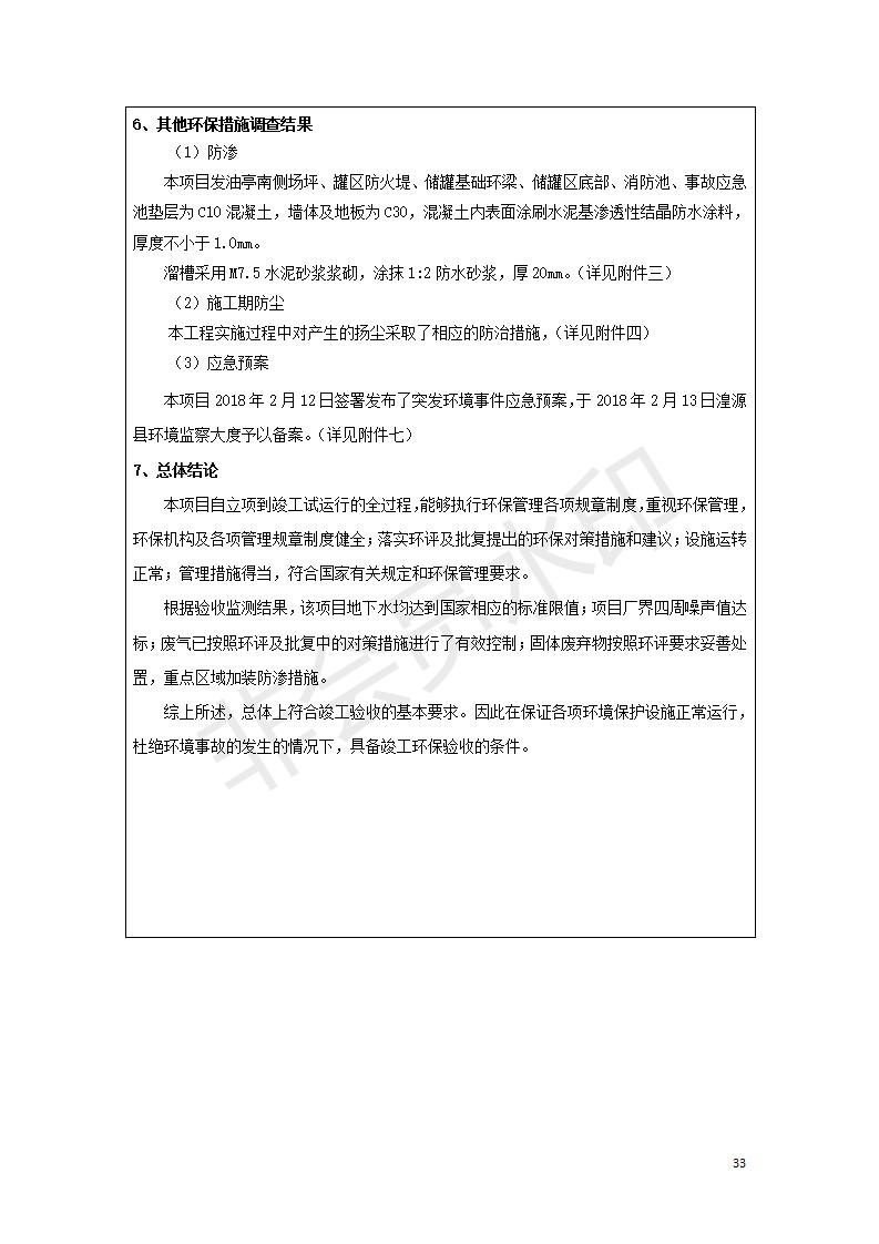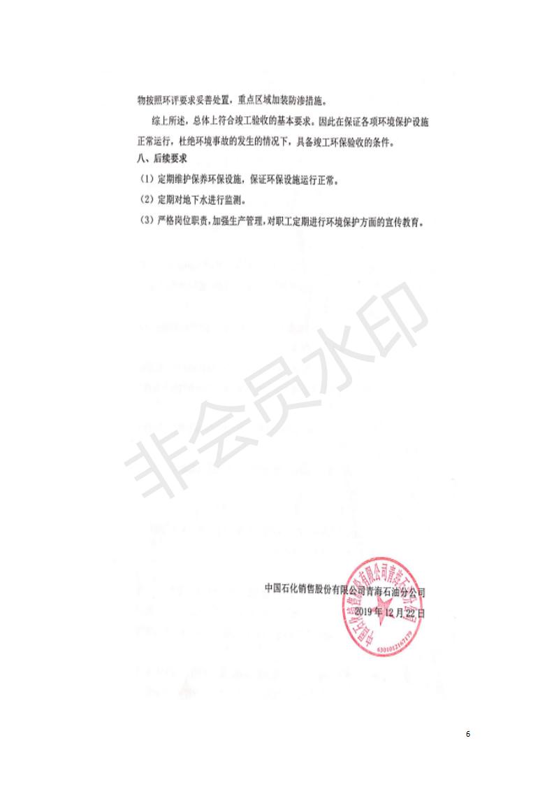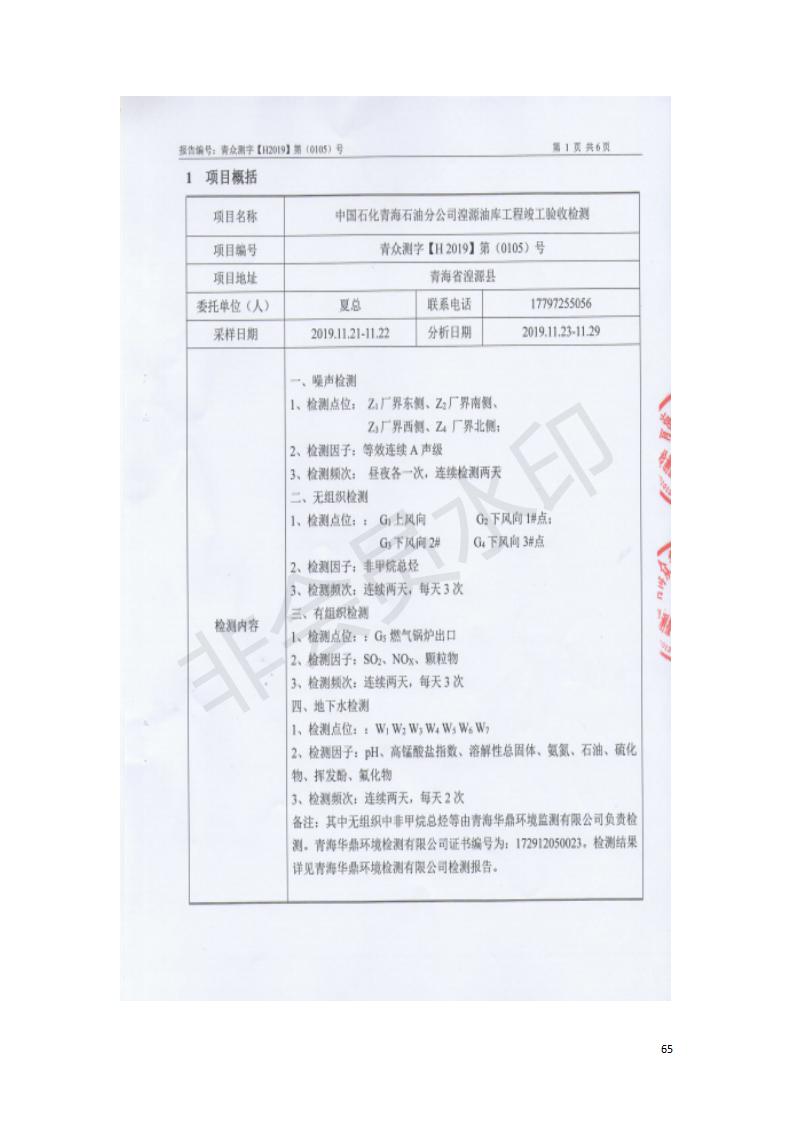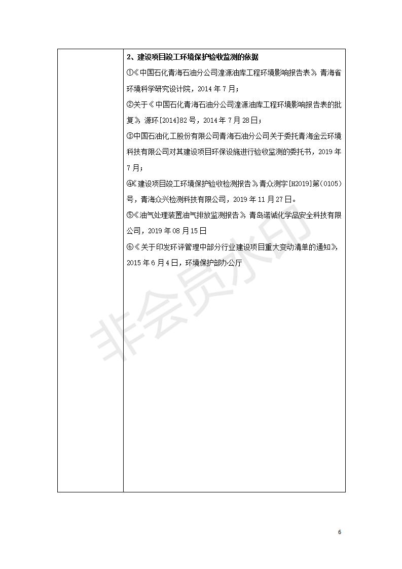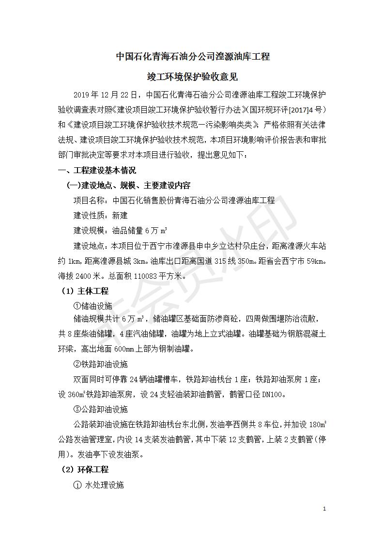 據(jù)中華人民共和國國務院令第682號《國務院關于修改〈建設項目環(huán)境保護管理條例〉的決定》和《建設項目竣工環(huán)境保護驗收暫行辦法》(國務院令682號),中國石化青海石油分公司湟源油庫工程建設項目(包括竣工環(huán)境保護驗收監(jiān)測報告表和驗收意見)公示如下。 一、項目名稱:中國石化青海石油分公司湟源油庫工程建設項目 二、地點:西寧市湟源縣申中鄉(xiāng)立達村尕莊臺 三、建設單位:中國石化銷售股份有限公司青海石油分公司 四、建設內(nèi)容:油品儲量6萬m3、其他配套設施。五、聯(lián)系人:董恒棟 六、聯(lián)系電話:18697130811 七、公示時間:二〇二〇年三月十三日至二〇二〇年四月十日 公示期間,對上述公示內(nèi)容如有異議,請以書面形式反饋,個人須署真實姓名,單位須加蓋公章。